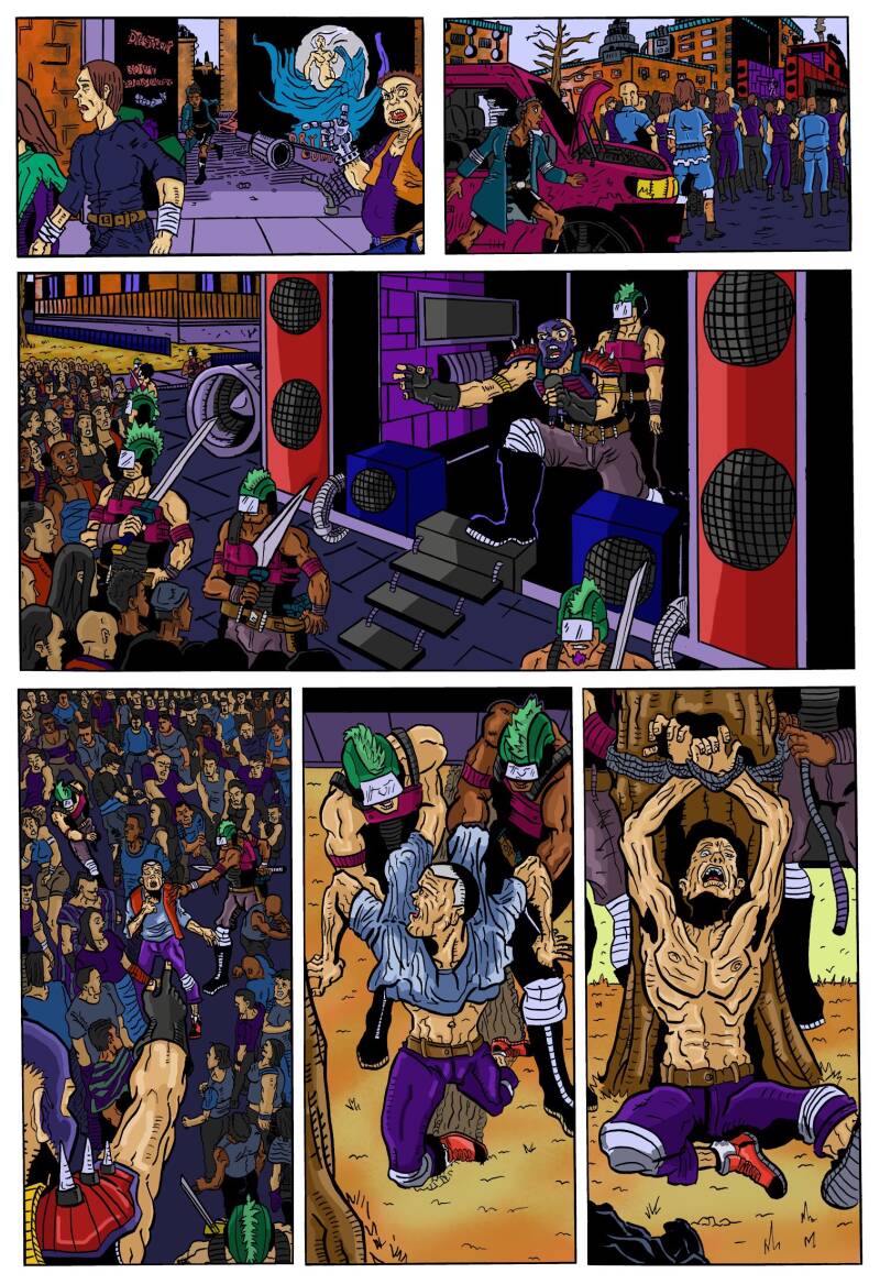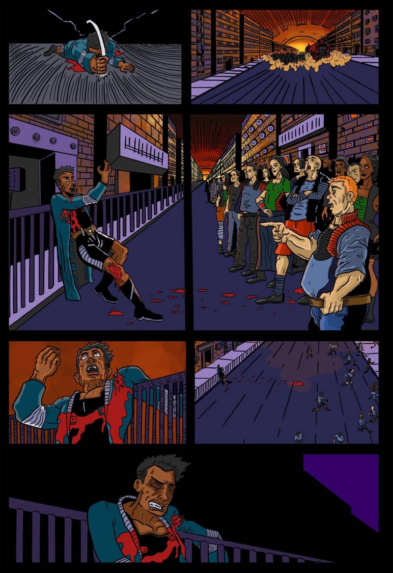 Page 9. Alexander pleads with the crowd to help him. Alexander gets to his feet bloodied and weary and irate with the onlookers.