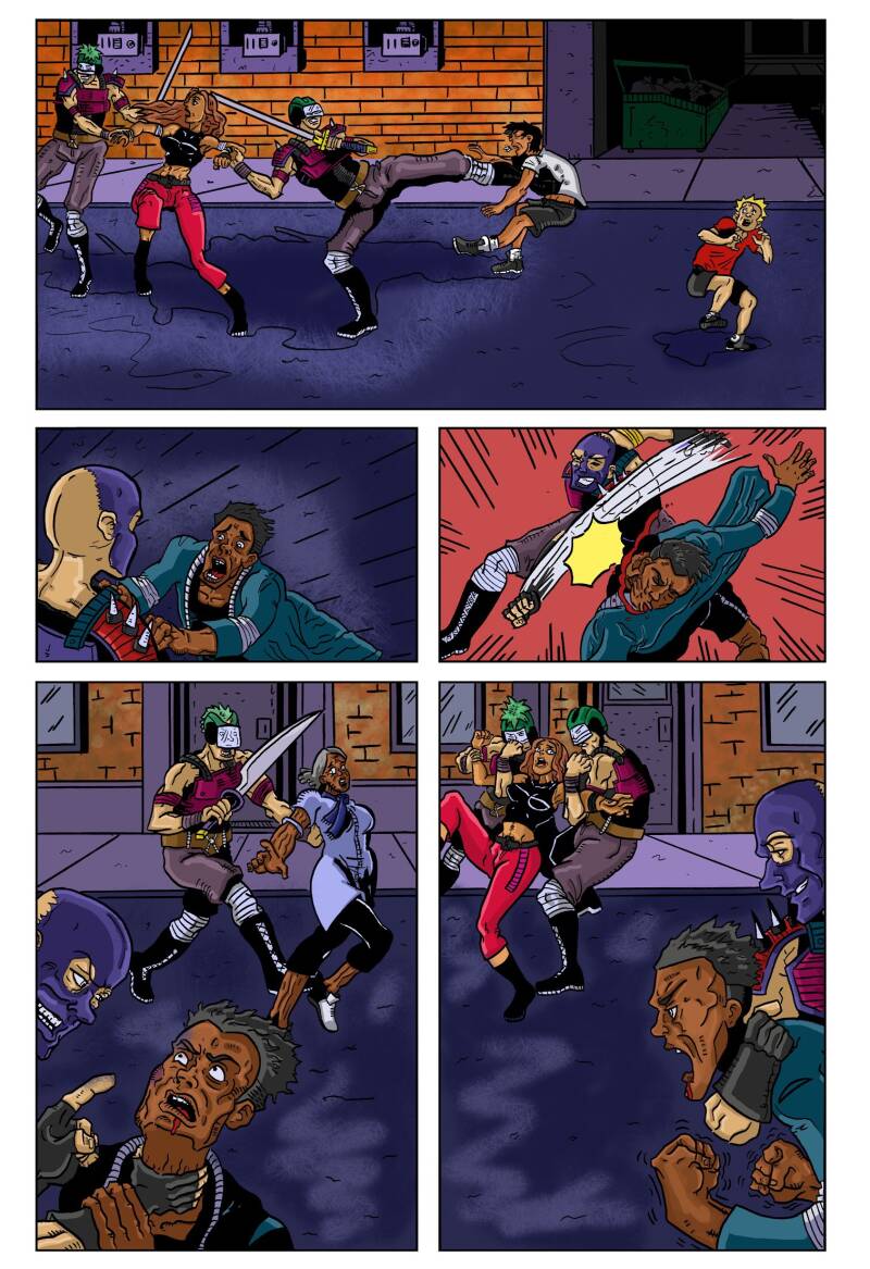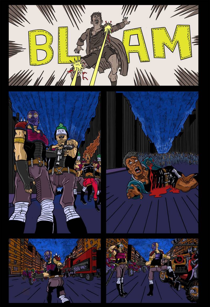 Page 2. This page shows Alexander sneaking towards Zeta Center. Commander Locke is demanding resources and whereabouts of Mcken Sheltox. Innocent civilians are picked on.